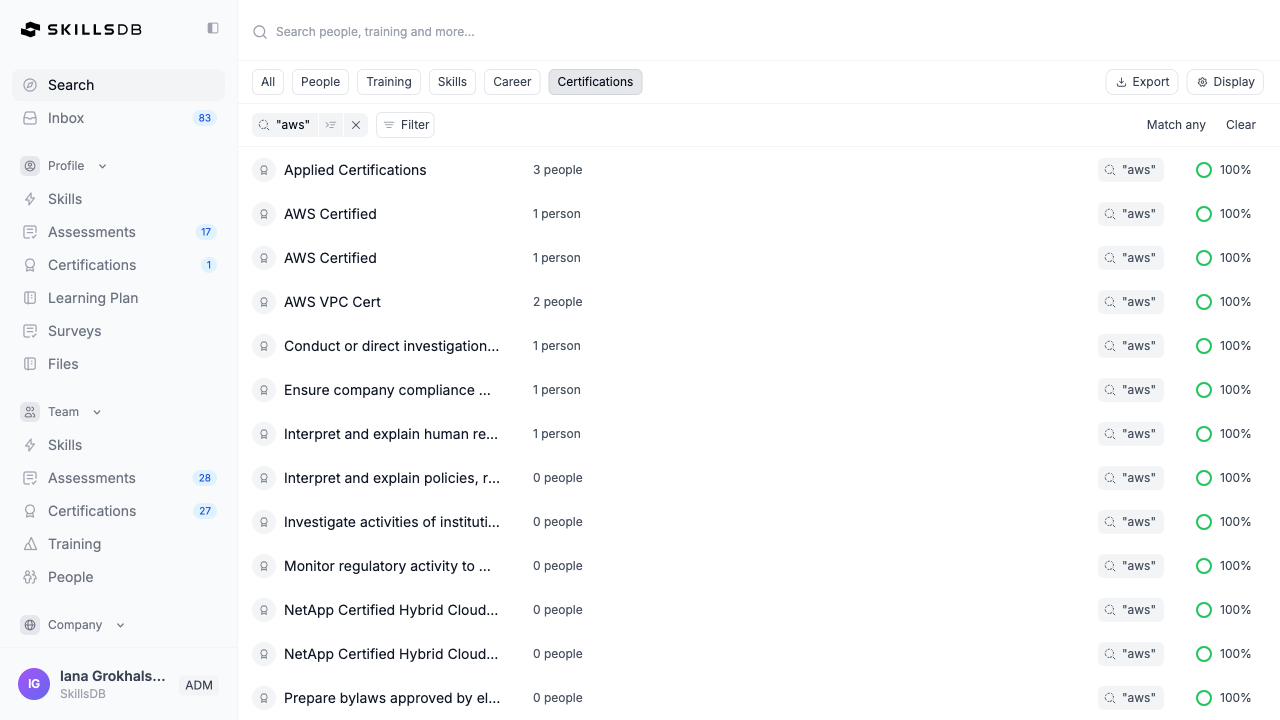 In Employee Certifications mode, each row represents an individual employee’s certification record. Each row displays the employee’s name with the certification name shown below it, along with the search criteria tags and match percentage.| Column | Description |