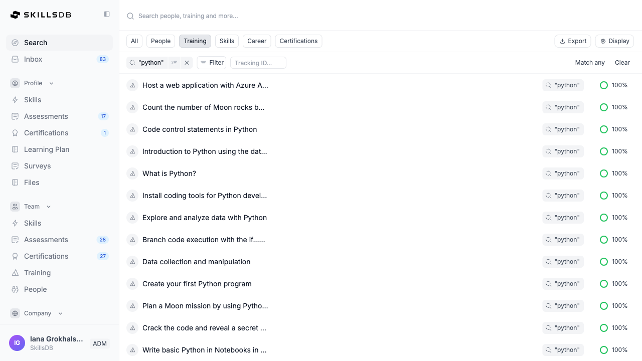 The Training section of Explore Your Org is your gateway to discovering all training resources available in your organization’s catalog. Whether you are looking for a specific course, exploring options to build a particular skill, or identifying development opportunities for your team, the Training search surfaces your entire training library in one searchable, filterable view. Training resources in SkillsDB are created and managed by your organization’s administrators. Each resource can include a title, description, provider, format, duration, cost, and target audience. Resources may also have associated skills and custom labels to help you understand what they are designed to develop. Using the Training search, you can discover resources that match your goals, review key details at a glance, and take immediate action — adding resources to your own learning plan or assigning them to members of your team. Who this is for:- Standard users can search the full training catalog, view resource details, and add training to their personal learning plan.