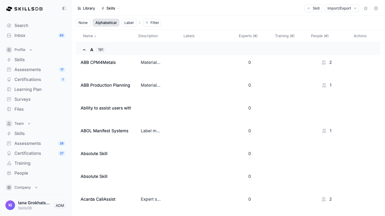 The Skills Library is the centralized catalog that holds every skill available in your SkillsDB environment. It serves as the authoritative source for all skills used in assessments, career profiles, learning plans, and skills matrices across your organization. Every skill in SkillsDB originates from the Skills Library. When a skill is added to the library, it becomes available for assignment to individuals, inclusion in careers, and use in assessments. Skills in the library can be tagged with labels for organization, enriched with learning resources, and analyzed for proficiency trends across your workforce. The Skills Library is primarily an administrative tool, but it is also a discovery resource for employees. Employees can browse the catalog, filter by labels, and add skills to their own profile directly from the library view. Who uses the Skills Library:- Administrators build and maintain the library — creating skills, assigning people, managing labels, and exporting data.
