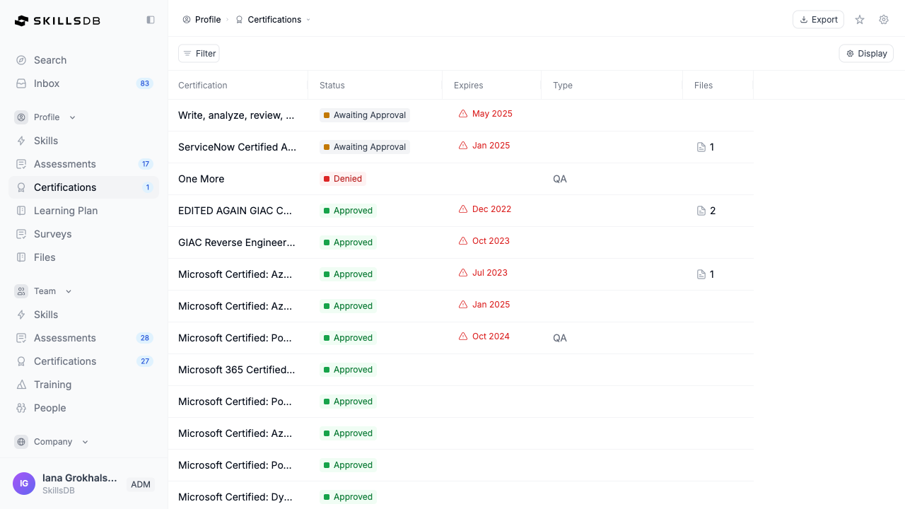 Certifications in SkillsDB represent your professional credentials — licenses, qualifications, and formal certifications that are relevant to your role. Your organization uses SkillsDB to track which certifications you hold, when they were issued, and when they expire. Certifications are assigned to you by your manager or an administrator. Once a certification is assigned, you are responsible for submitting the details — such as your issued date, expiration date, credential ID, and any supporting documents. Your manager or administrator then reviews and approves your submission. All employees can view and manage their own certifications. You do not need any special permissions to view your Certifications page or submit certification details. However, you cannot add certifications to your own profile — certifications must be assigned to you by a manager or administrator.Note: If you believe a certification should appear in your list but it does not, contact your manager or administrator to have it assigned to you.